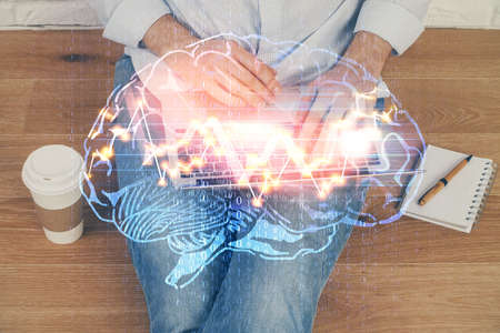 Man with computer background with brain theme hologram. Concept of brainstorm. Double exposure.