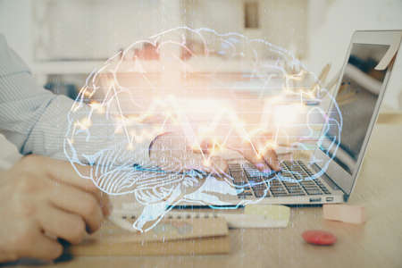 Man typing on keyboard background with brain hologram. Concept of big Data. Double exposure.