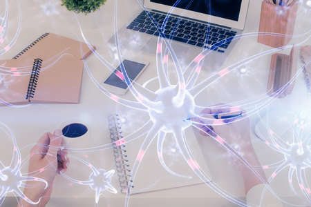 Neuron hologram over hands taking notes background. Concept of research and study. Double exposure