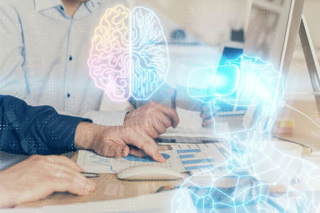 Two business people working together on IT project. Brainstorm concept. brain hologram. Double exposure.