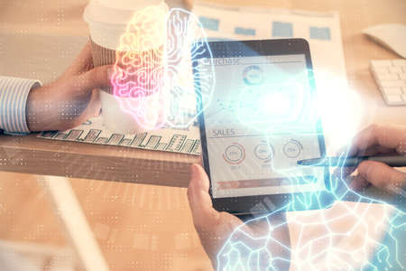 Double exposure of man and woman working together holding and using a mobile device and brain hologram drawing.
