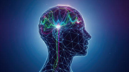 This image showcases a stylized human head profile overlaid with a digital representation of brain activity. The artwork features vibrant lines tracing thought processes against a gradient background of blues and purples. The composition employs a low-poly aesthetic with bright, artificial lighting suggesting a modern, tech-focused environment. It is suitable for scientific, educational, and design projects.