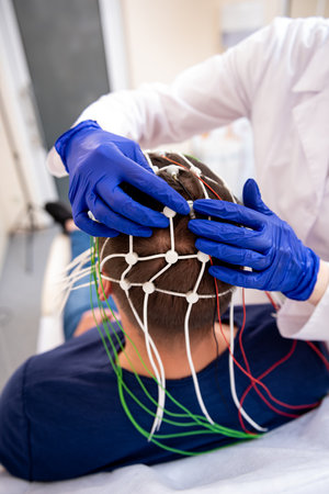 Doctor and patient with encephalography electrode. Electroencephalogram