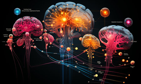 This stunning 3D visualization showcases a human brain with vibrant neural pathways, highlighting complex structures and illustrating cognitive functions and connections.