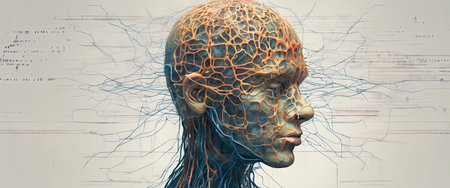 This striking illustration features a human brain with intricate neurons and blood vessels emanating from the side profile, symbolizing thought and consciousness.