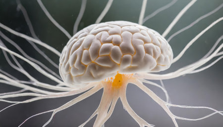 Abstract jellyfish resembling brain floating in turquoise water, symbolizing creativity and consciousness with ethereal elegance