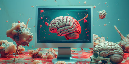 Surreal image of brain on computer screen with colorful gooey substances and skull, surrounded by various objects creating an intriguing scene.