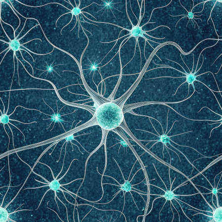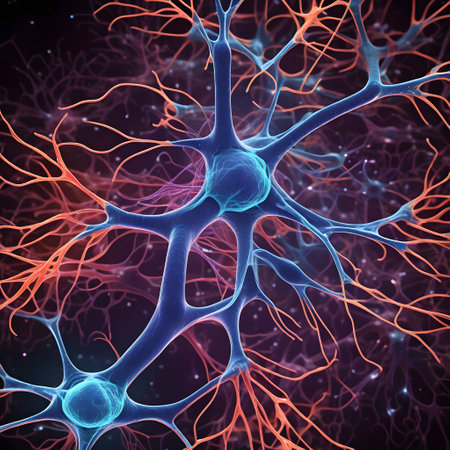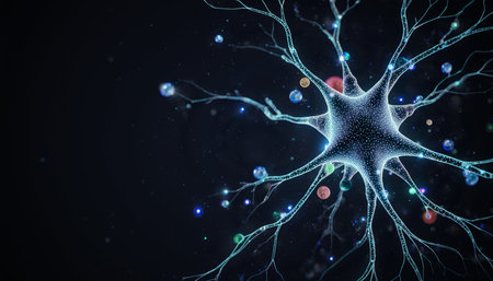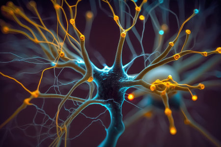 Close-up illustration of a neuron displaying vibrant electrical activity and intricate connections.