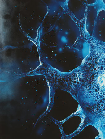 A detailed depiction of a neural network, showing intricate branch-like extensions in a cool blue microscopic setting, highlighting signal transmission at cellula