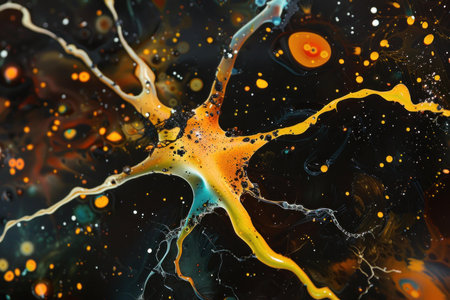 A detailed digital illustration showcases a vibrant network of neurons firing signals and glowing in deep space.