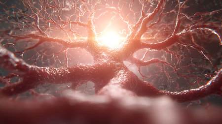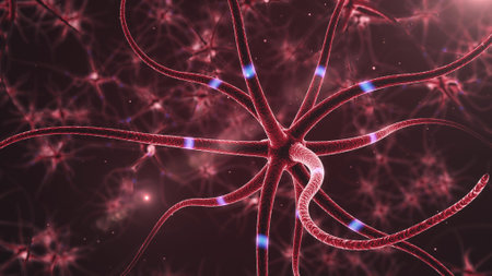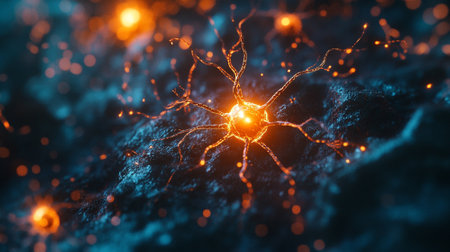 A detailed depiction of neuron activity showcases the complex web of connections within the nervous system. The bright synapses highlight the importance of communication between cells.