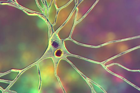 Healthy neuron with lysosomes, brain cell, 3D illustration, close-up view