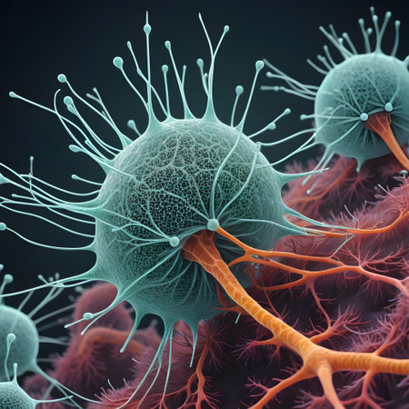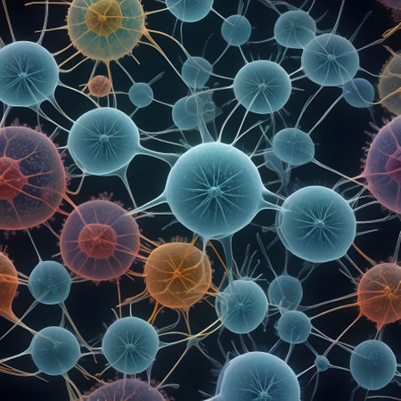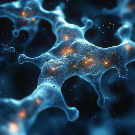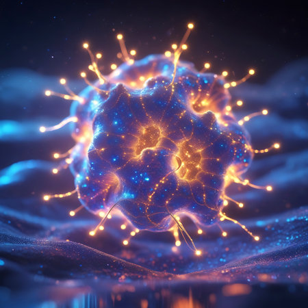 A detailed, glowing microscopic cell with a textured blue and orange surface. Numerous bright orange light tendrils extend outwards from the cell, creating a luminous network against a dark, ethereal background. Small blue and orange particles are scattered around, adding to the sense of depth and energy. The image evokes a feeling of scientific discovery and the intricate beauty of the unseen world.
