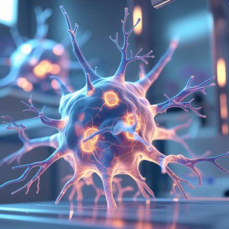 Detailed view of a glowing neuron cell with branching dendrites, illuminated with vibrant blue and orange light, in a modern laboratory environment.