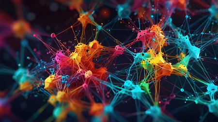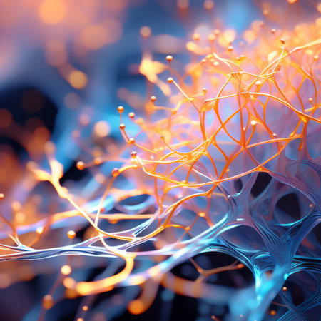 Abstract depiction of interconnected neural network structures with glowing orange nodes, set against a vibrant gradient background of blue and pink hues.