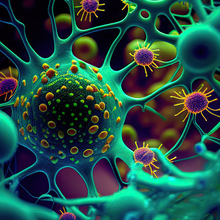 Abstract depiction of a virus or microscopic organism with glowing yellow nodes connected by fine lines, set against a vibrant pink and blue blurred background.