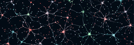 A network of flat neurons, resembling a colorful constellation map, creates an intricate design against a dark backdrop.