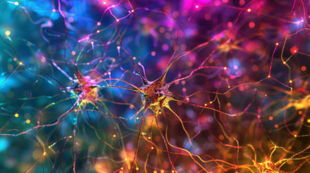 Intricate neural network connections in a digitally enhanced visualization with vibrant colors and dynamic lighting.