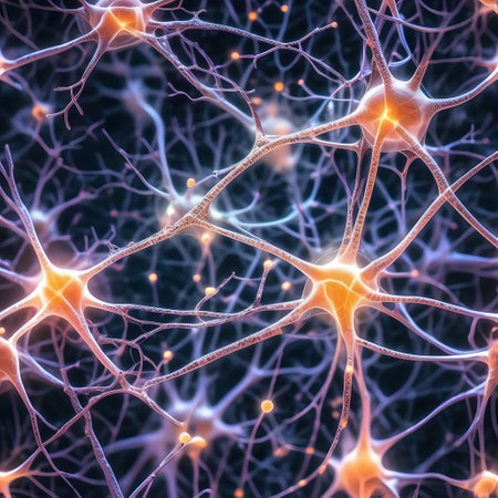 Neural network illustration. A detailed artistic rendering of interconnected neurons with highlighted synapses in warm orange tones on a dark background.