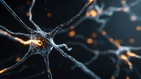 This stunning image captures a detailed neuron featuring glowing synapses amidst a dark abstract background, illustrating the complexity of neural connections and brain activity.