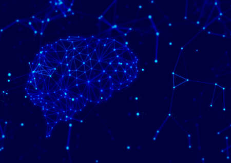 Colorful low poly brain illustration isolated on dark blue cover banner background