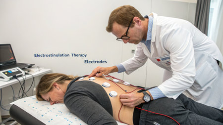 A Therapist Placing Electrodes doctor performs electrostimulation therapy on patient using electrodes on back in clinical setting