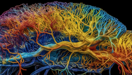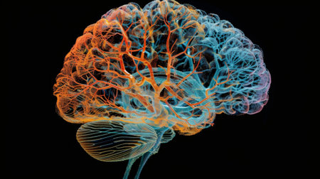 This stunning 3D visualization showcases a human brain with vibrant neural pathways, highlighting complex structures and illustrating cognitive functions and connections.
