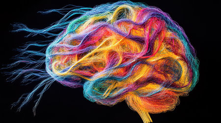 A vibrant representation of the human mind, where a complex network of colorful wires forms the shape of a brain.