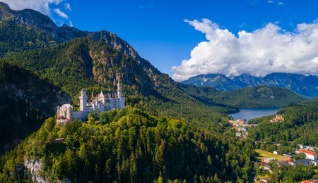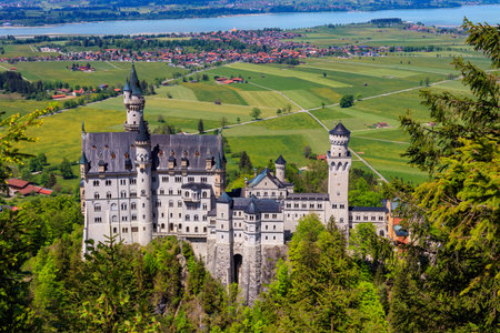 Panoramic view from the observation deck near Neuschwanstein Castle to the magic landscape with Hohenschwangau castle, Bavarian Alps, Schwansee, Alpsee. Bavaria. germany.