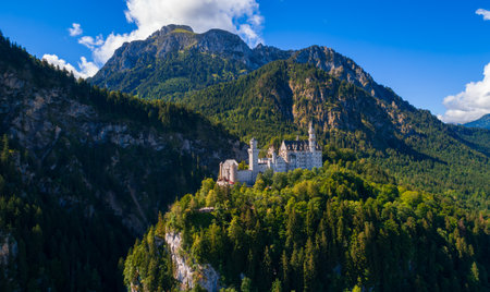 Aerial View of Neuschwanstein Castle Amid Forested Mountains in Bavaria