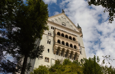 Castle Neuschwanstein: A view looking up at a white stone castle tower with arched windows surrounded by tall trees under a cloudy sky.