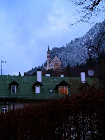Snow-covered castle overlooking a quaint village at dusk in the Bavarian Alps