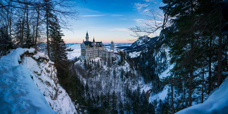 Panorama of Neuschwanstein Castle at sunrise, winter season, Schwangau, Bavaria, Germany