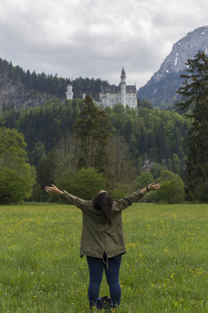 brunette woman with green jacket poses on a green meadow from which Neuchswanstein Castle is seen surrounded by forest and mountains