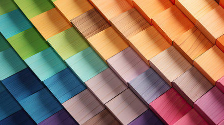 A collection of wooden cubes presents a vibrant display of colors and textures. Each cube exhibits unique shades, including teal, red, and orange. The composition, viewed from an overhead perspective, showcases the cubes on a flat surface. Suitable for visual concepts and projects.