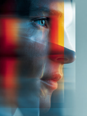 A youth's side profile bathed in lively, colorful light patterns that evoke cutting-edge tech and digital progress, highlighting expression and visionary energy.