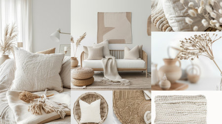 The moodboard illustrates a harmonious Scandinavian interior with neutral colors, textured fabrics, and natural decor elements, creating a tranquil and inviting atmosphere.
