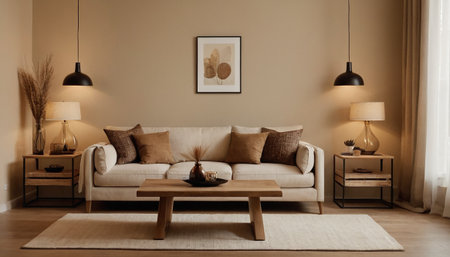 Living room interior with frame , natural wooden furniture and trendy home accessories on bright beige background, ,