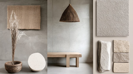 Explore a serene display of natural decor elements that combine minimalist design with rustic textures. This arrangement features neutral tones, organic shapes, and a harmonious balance, ideal for creating a calming ambiance in modern interiors.