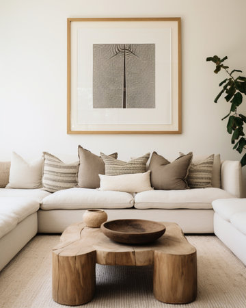 A sophisticated living room scene featuring a designer sofa adorned with plush pillows. A striking black art piece captures attention, enhancing the modern decor aesthetic.