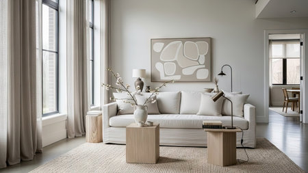 Modern minimalist living room interiors in neutral tones, with stylish furniture and natural lighting. Apartment interior design composition with copyspace.