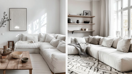 The first image shows a white couch with a white rug and a coffee table. The mood of the first image is calm and serene