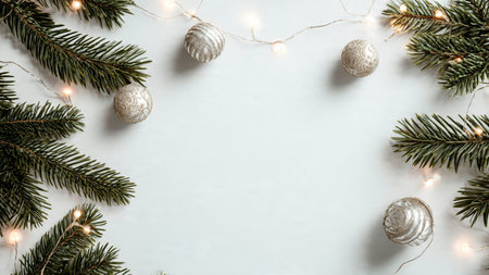 Contemporary minimalist Christmas background with pine branches and ornaments.