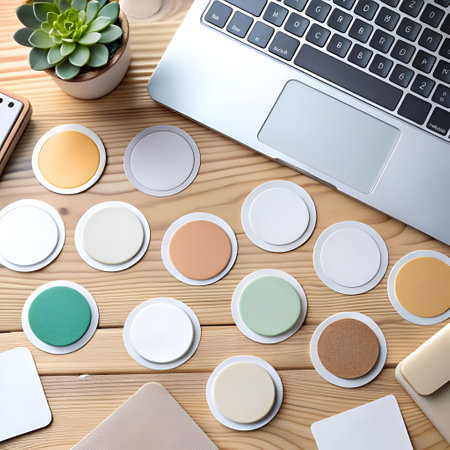 A flat lay photo of a wooden table with various colorful round objects. a laptop. and a small potted plant. The scene is perfect for showcasing your brand. products. or message in a creative and engaging way.