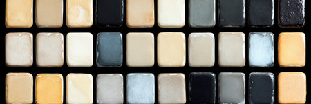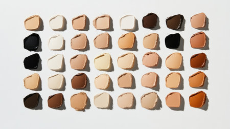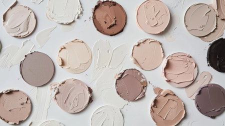 Mosaic arrangement of skin toned concealer or foundation smudges in beige green brown and neutral shades displayed on neutral surface illustrating diverse color options for makeup coverage and blending