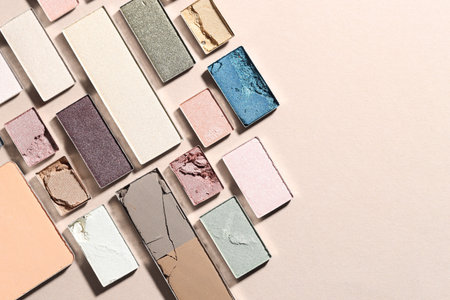 Beautiful eyeshadow refill pans on beige background, flat lay. Space for text