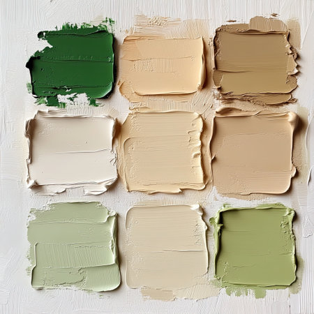 Colorful paint swatches arranged in a square grid showcasing various earth tones and greens in a creative workspace