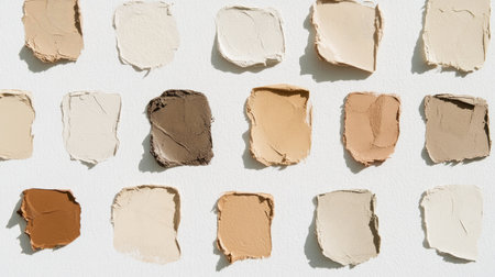 Abstract arrangement of colorful paint swatches on a white background showcasing various shades of nude and brown tones