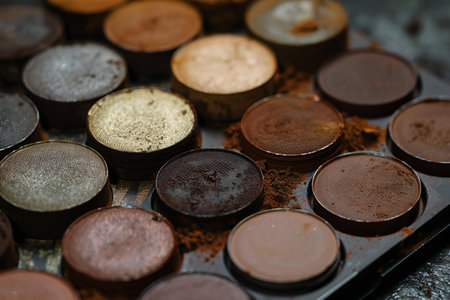 A close-up image of numerous round swatches of different brown shades of makeup on a white background.