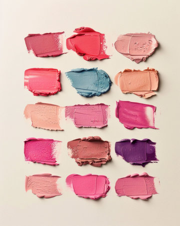 The image displays cosmetic textures and makeup samples. Various shades, including beige, white, orange, and gray, are presented. The composition features a circular element with split colors, and swatches are arranged on a textured backdrop. Ideal for beauty product promotion and related editorial content.